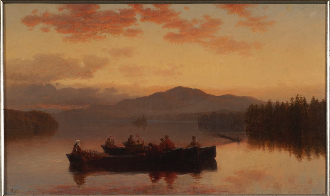 In this 1874 painting "Evening on Lake Raquette, Adirondacks," James D. Smillie depicts a party of people socializing in guideboats at twilight. The artist captures the magical moment when the clouds are undershot with colors from the setting sun. West Mountain is an ethereal silhouette in the distance.