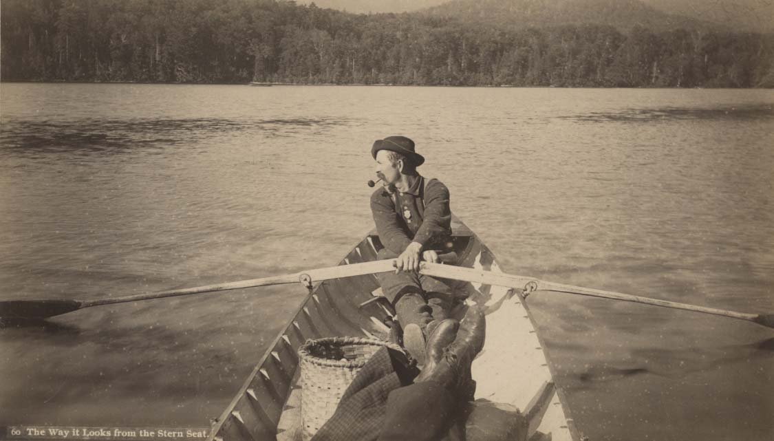Photographer Seneca Ray Stoddard captured this now-famous image of his view from the stern seat of a guideboat sometime around 1880. You can see the photographer's own feet in the foreground, resting on some of his gear. The rower is Charlie Blanchard, a guide from Blue Mountain Lake.