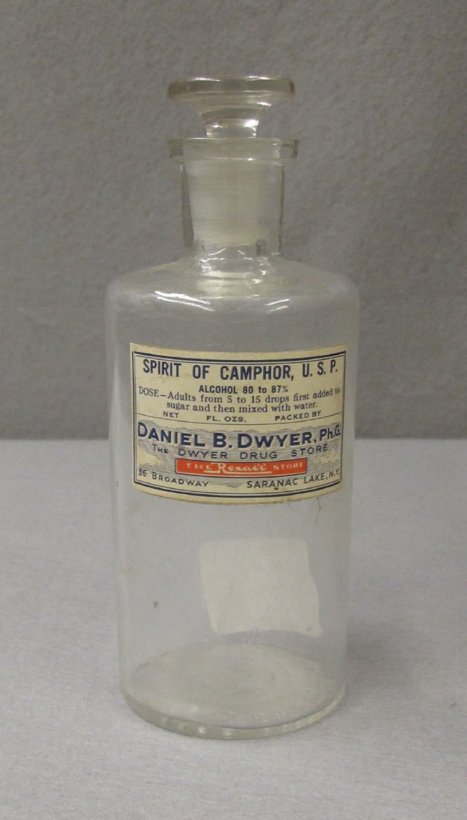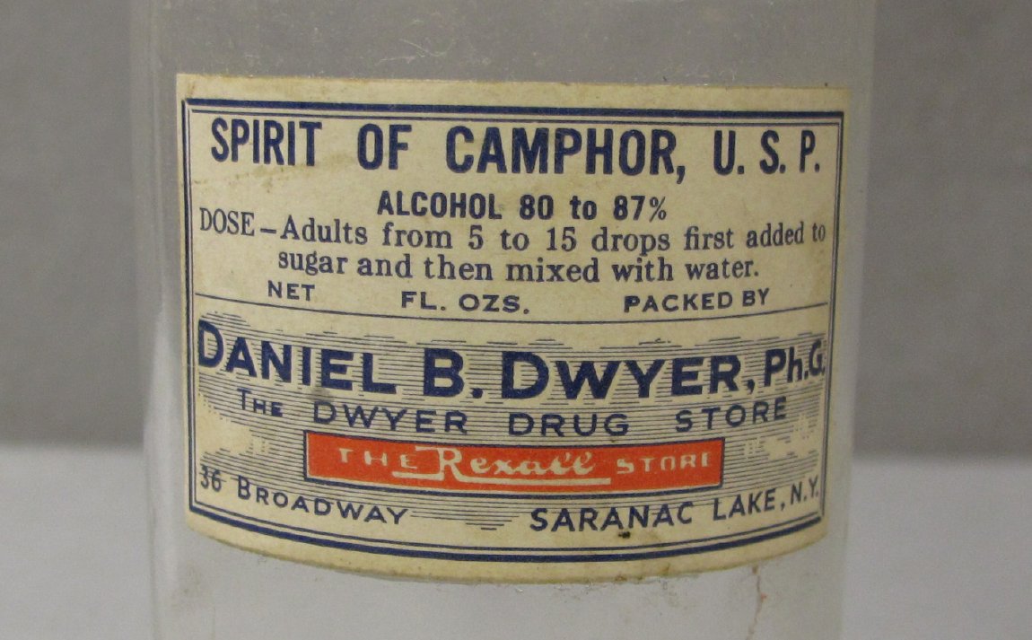 Spirit of camphor is used to alleviate pain and relieve nasal and chest congestion. This bottle was sold by pharmacist Daniel B. Dwyer in Saranac Lake in the first half of the 20th century.