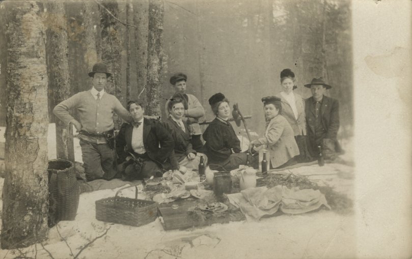Harold Chaffee, at far left with the pistol on his belt, poses with fellow tuberculosis patients while on a winter picnic in Ray Brook.
