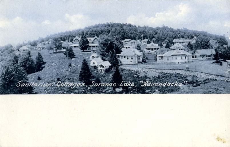 Saranac Lake was once called the "City of the Sick." The village grew up around the Trudeau Sanitorium, a large hospital facility specializing in the treatment of tuberculosis. This postcard, marketed to patients, shows some of the cure cottages at the "san."
