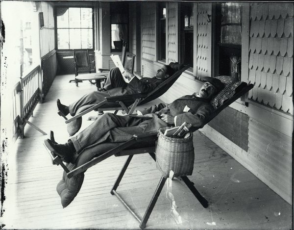 William Kollecker, a professional photographer and himself a former patient, took this photo on one of the cure porches at the Trudeau Sanitorium. Patients followed a strict diet and routine, spending most hours in the open air. This man's chair features a packbasket filled with reading material to keep him occupied.