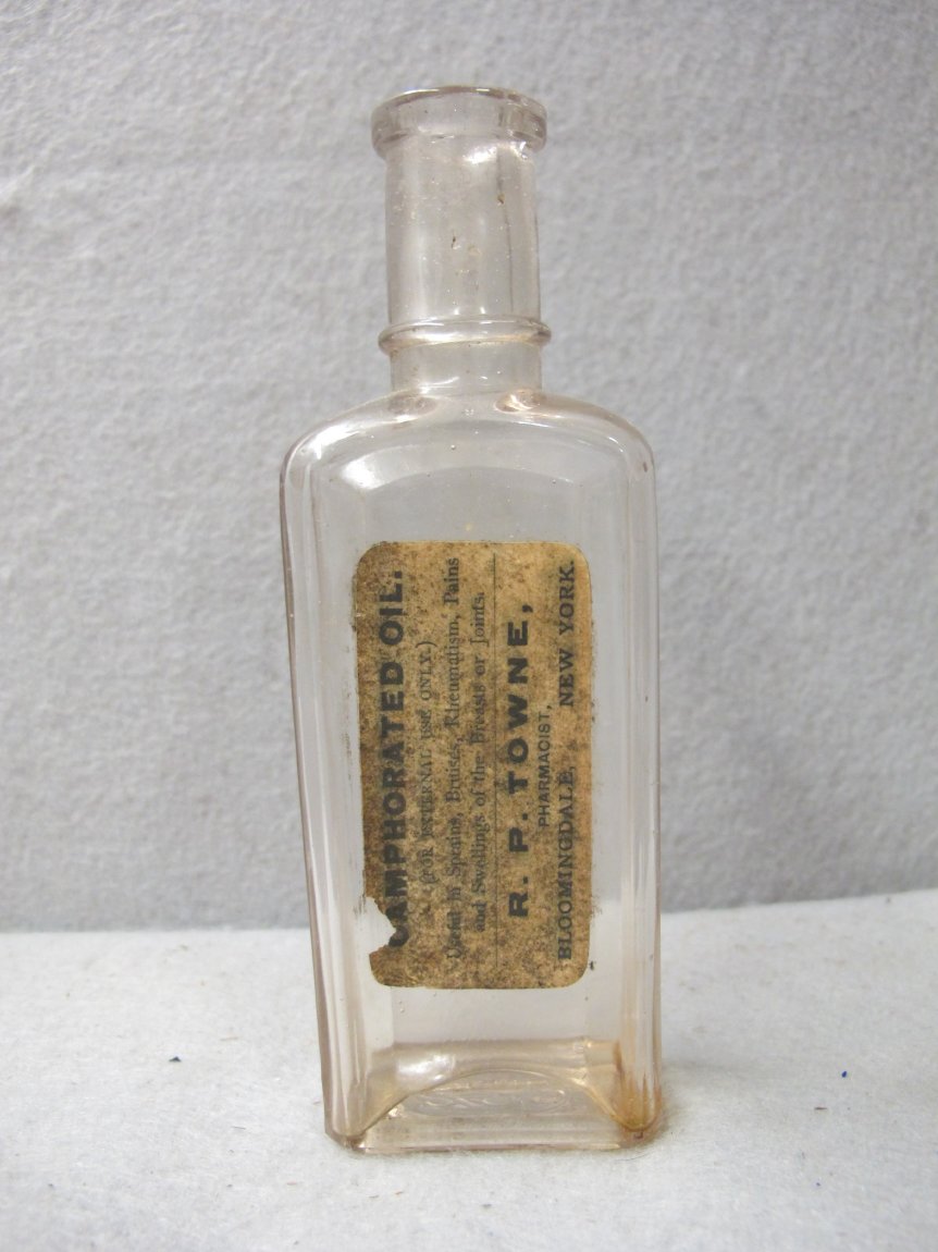Pharmacist R.P. Towne, of Bloomindale, sold this bottle of camphorated oil to a customer suffering from pain or swelling caused by sprains, bruising, or rheumatism.