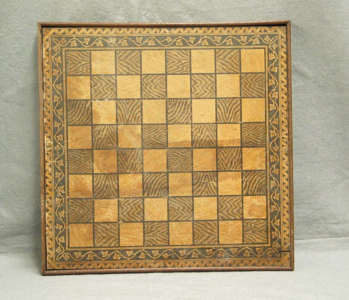 Both checkers and chess may be played on the same board, eight squares per side, 64 in all. This board came from a camp on Lake George.