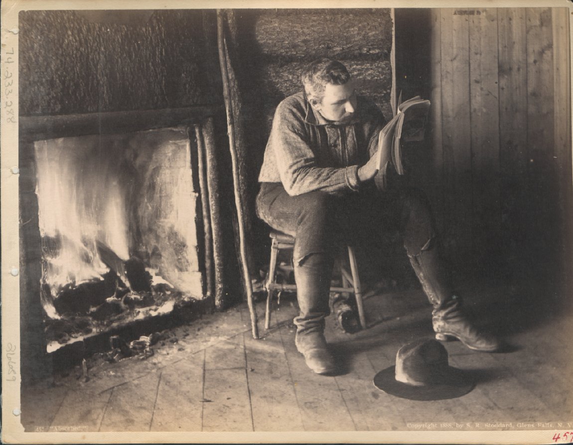 Robert Jeremiah Peck (1862-1929) sits by the fire to read in this photograph by Seneca Ray Stoddard. Peck moved to Long Lake in 1880 and served as a guide for Stoddard. In 1889 he left the Adirondacks for Florida.