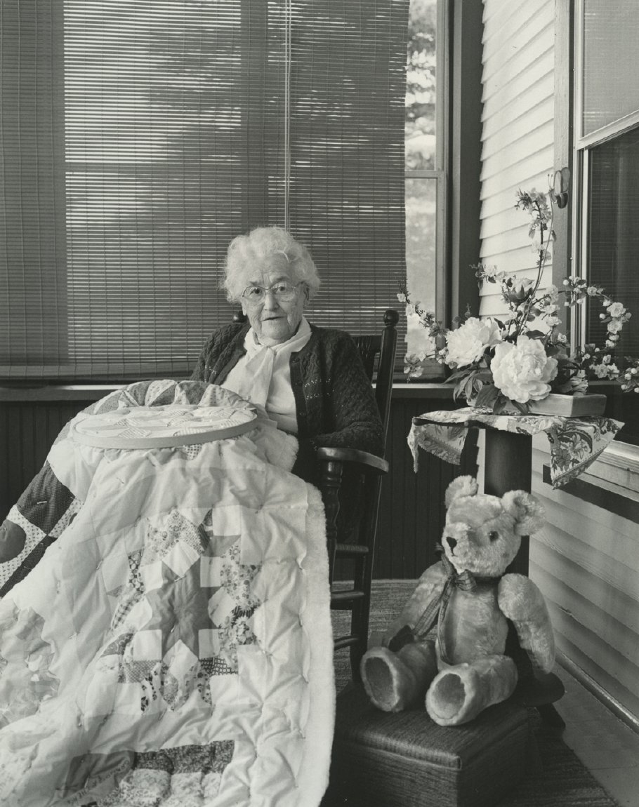 Pauline Newell was known for her quilts, often donating her work for charitable causes in and around her Paul Smiths community. Photographer Mathias Oppersdorf's portrait shows her at work, accompanied by a favorite Teddy bear, on her porch.