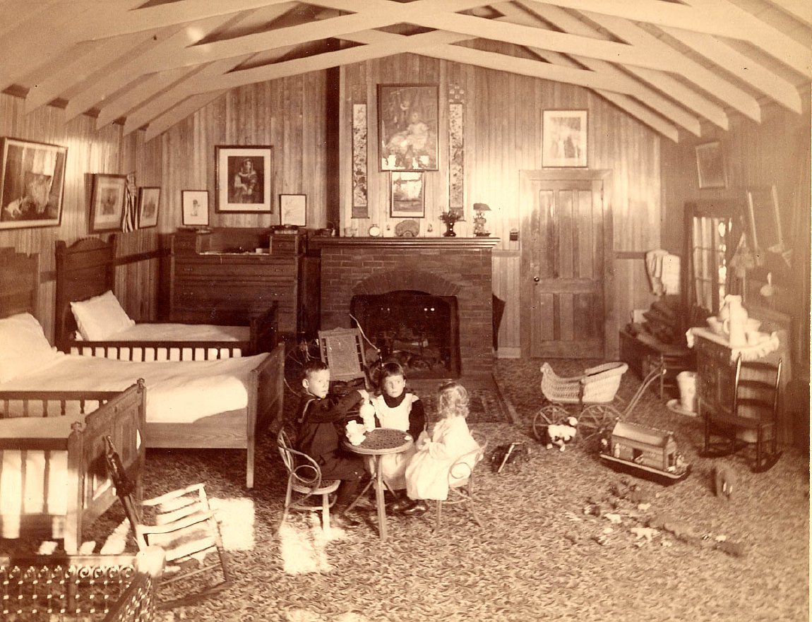 Lawrence, Heloise, and Basil Durant have a tea party in their nursery at Great Camp Pine Knot. Children's toys, including a Noah's Ark and a doll carriage, are scattered about the room.