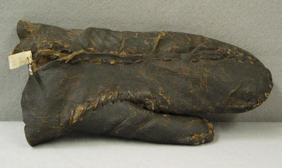Keeping warm in the woods was a life or death proposition. Noah John Rondeau made clothing, including this mitten, from materials at hand. Deer hide, bear skin, and fur from smaller animals provided the raw materials for clothing and blankets. He sometimes allowed the raw hide to cure while in use--his hat, made of muskrat, was a notorious example.