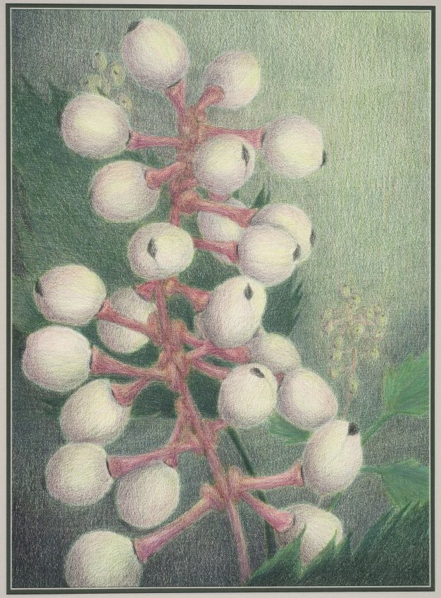 White baneberry produces delicate white flowers in the spring but it is best known for its appearance in late summer. Its nickname, "doll's eyes," comes from the bunches of distinctive white berries with a purple spot produced in late summer.