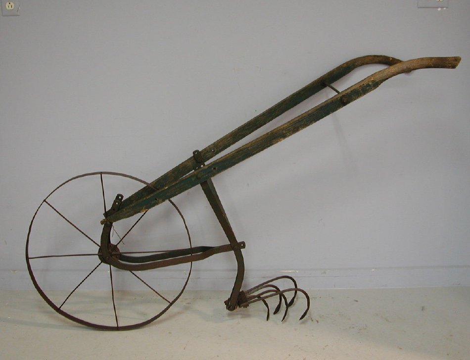 Walking cultivators like this one are designed to prepare the soil for planting and to control weeds once the plants are in. Widely used by households with smaller plots in the 19th and early 20th centuries, devices like this are still available. This model, made by an unidentified manufacturer, was used by the Wolff family in the Saranac Lake are.