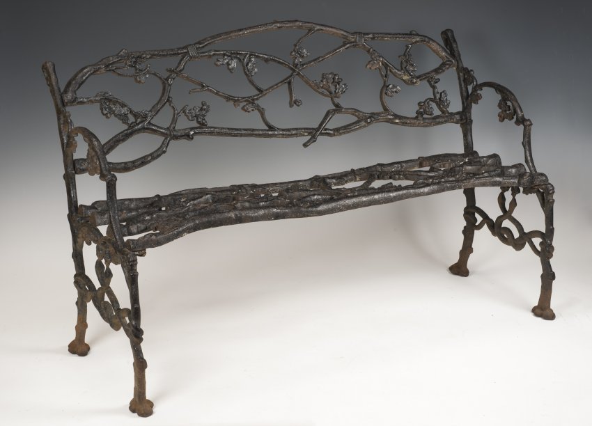 Cast iron benches like this were designed to complement their garden settings; comfort was rarely a consideration. This bench was purchased by the Hand family in Elizabethtown from J.W. Fiske & Co. at the end of the 19th century. The seat, back, and legs mimic the look of oak branches, with leaves and acorns.