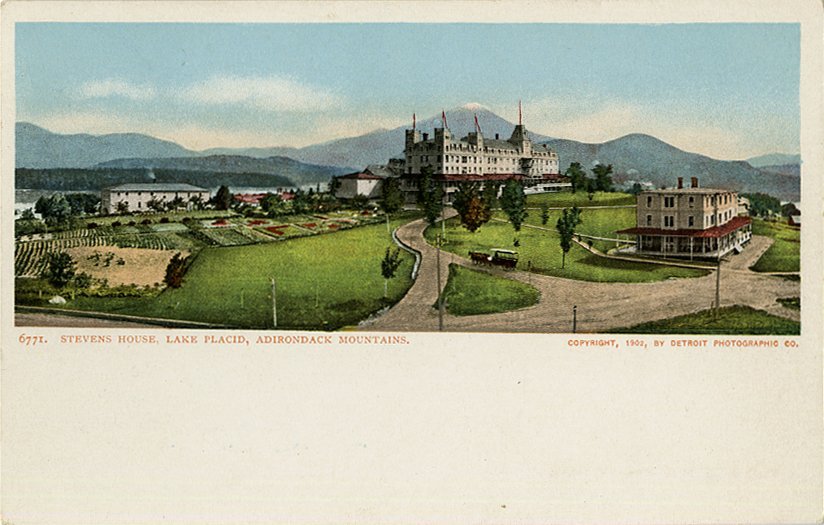 The Stevens House in Lake Placid was ideally located to take advantage of the scenic views that make the High Peaks region a popular tourist destination. A landmark on Signal Hill for more than 50 years, the hotel advertised that "two hundred acres…are under cultivation as a farm and garden, which supply an abundance of fresh vegetables, eggs, butter, cream, milk and cheese." Guests strolled in a large ornamental garden along paths that radiated out from a central circular flower bed.
