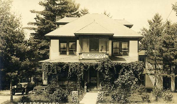 Neatly-trimmed, weed-free lawns were not common in the United States until well into the 20th century. The proprietor of the Edgewood in Rainbow Lake cultivated a vine for the porch and a variety of shrubs in the yeard, but the grass is unkempt by today's standards.