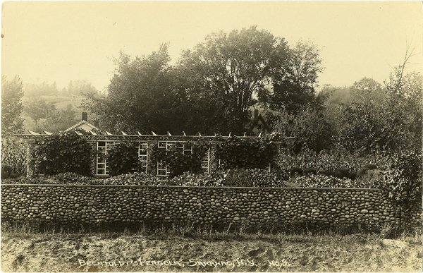 The cobblestone wall built in the early 20th century for the Edward and Jennie Bechtoldt farm still stands along Route 3 in Saranac. The pergola supported vines (perhaps hops) that also provided shade below. Forty acres of the 70-acre farm were tilled; the Bechtoldts kept the rest in timber and pasture.