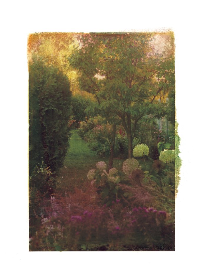 Like many artists, Ellen Phelan finds inspiration in nature. In 2008, she created a series of hazy, romantic views of her beloved gardens at Kenjockety, her estate in Westport. Combining photography, painting, and digital printing, she melds traditional artistic practive with modern technology to create this image of a hydrangea and cedars.