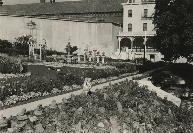 The warden's house at Clinton Correction facility in Dannemora was built in 1880 and boasted its own ornamental gardens. In this rather fussy iteration, Sunbonnet Sue, a popular quilting design adapted as a garden ornament, stands over a slope adorned with rocks, grasses, and groundcovers.