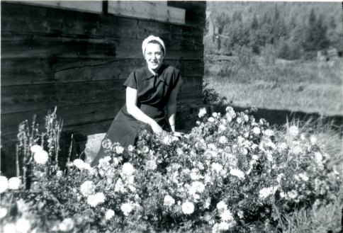 This image was found in box of photographs in a Blue Mountain Lake home after new owners moved in. The house once belonged to Alta Potter Johnson (1920-2000) who served as Postmaster in the village in the 1950s. The woman in the photo is not identified, but is perhaps Johnson herself, posing in a bed of zinnias.