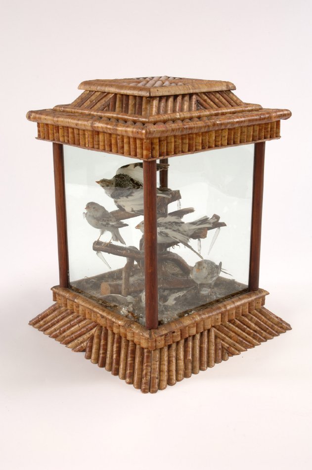 A neighbor remembered visiting William Jones "in his workshop at Childwold Park on Lake Massawepie…Mr. Jones had created much rustic furniture for what was then known as Childwold Park Hotel." Jones is attributed as the maker of this case housing an arrangement of taxidermied snow buntings.