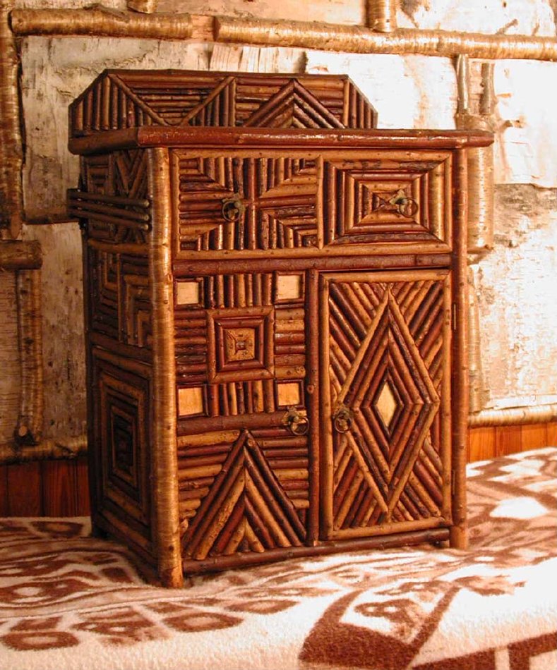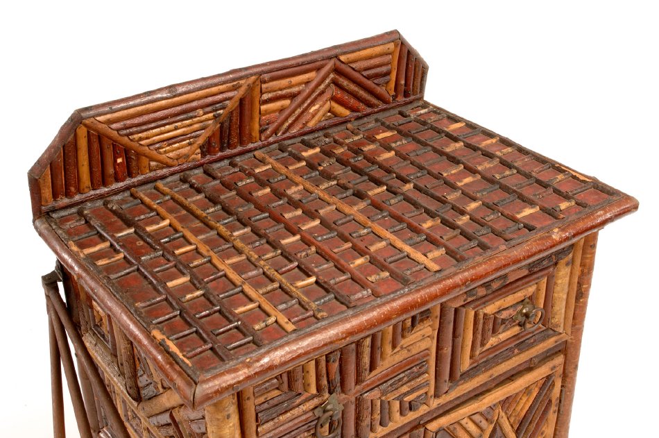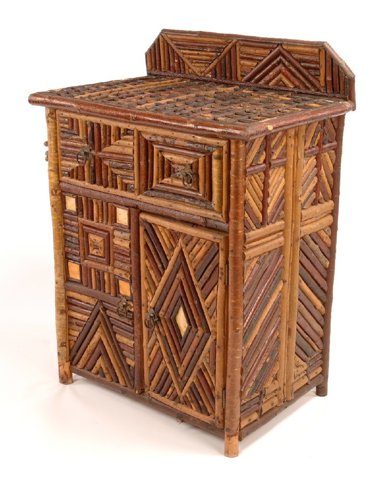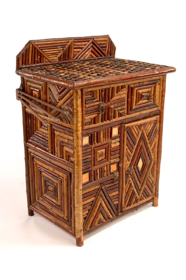 This washstand was made by an unidentified maker for Great Camp Hemlock Ledge in Tupper Lake. The top features a ladder pattern of split twig over a painted canvas cloth. The sides feature a variety of geometric mosaic designs.