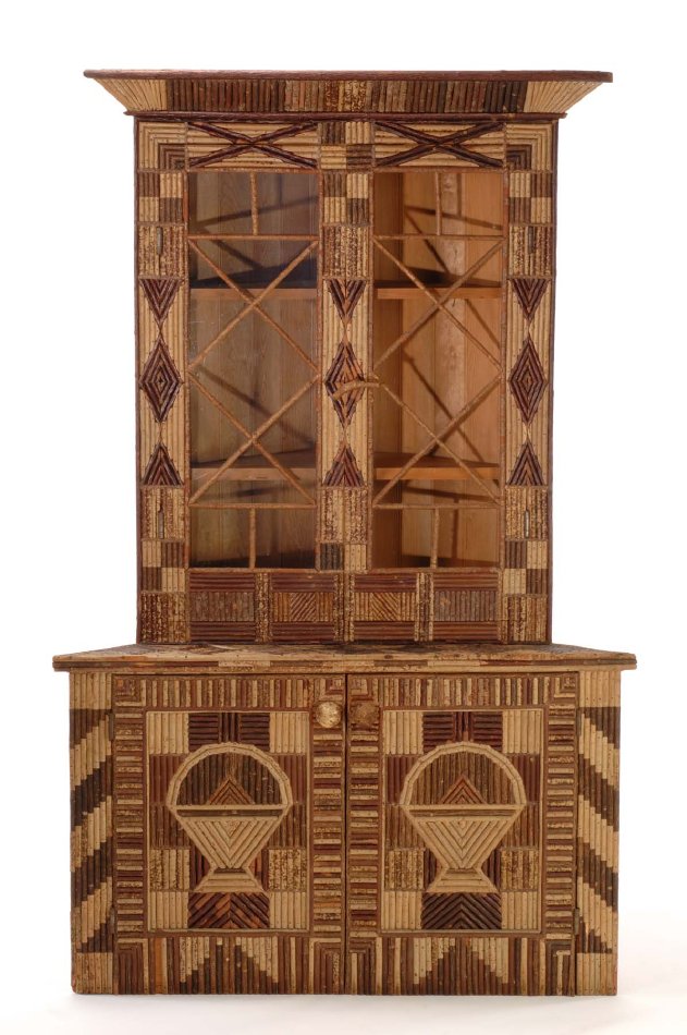 Seth Pierce (ca. 1824-1911) made this corner cupboard for Camp Cedars on Little Forked Lake. He used 11 species of wood in twig mosaic: sugar, swamp and striped maple; white and yellow birch; beech; ash; wild cherry; shadbush; witch hazel; and poplar. The doors on the base of the cupboard feature a 19th century quilt design called Flower Basket.