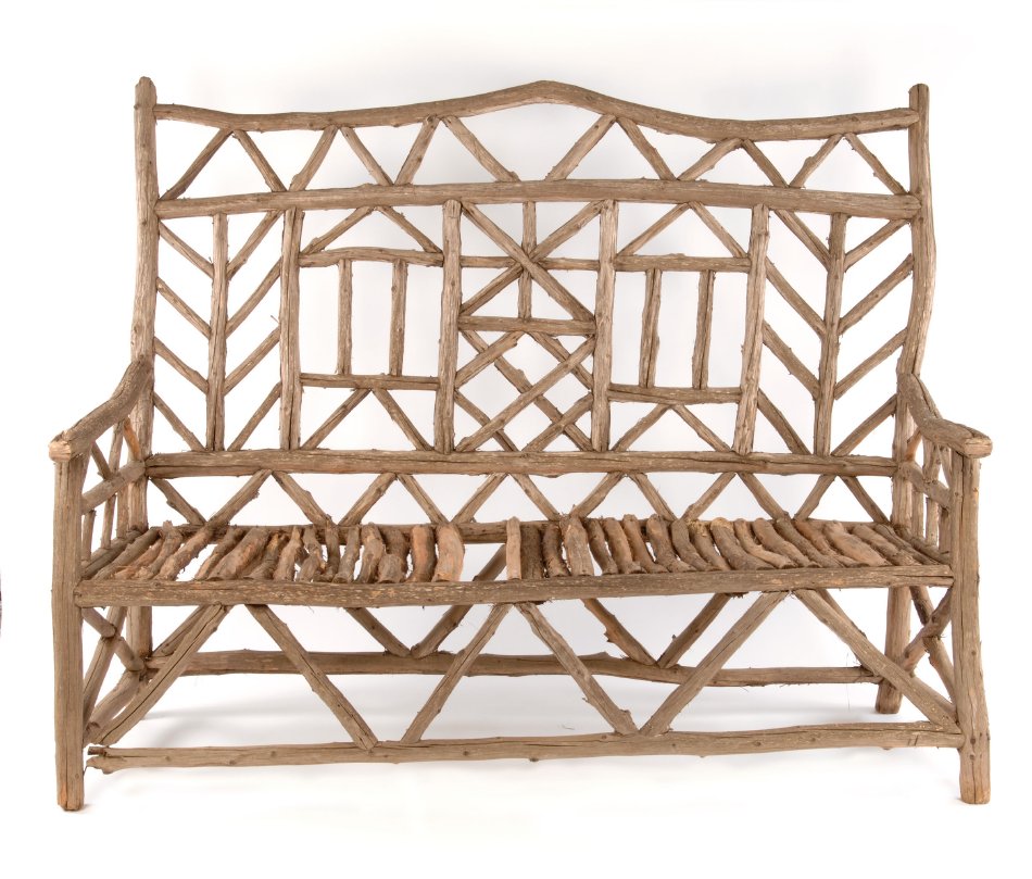 Attributed to Fred Bass, this nicely-proportioned tall back settee was made for Aiden Lair in Minerva, where Theodore Roosevelt paused on his midnight ride to the presidency. Its unpeeled cedar has weathered, removing most of the bark. The seat was replaced sometime in the 1970s while in use at a family camp in Long Lake.