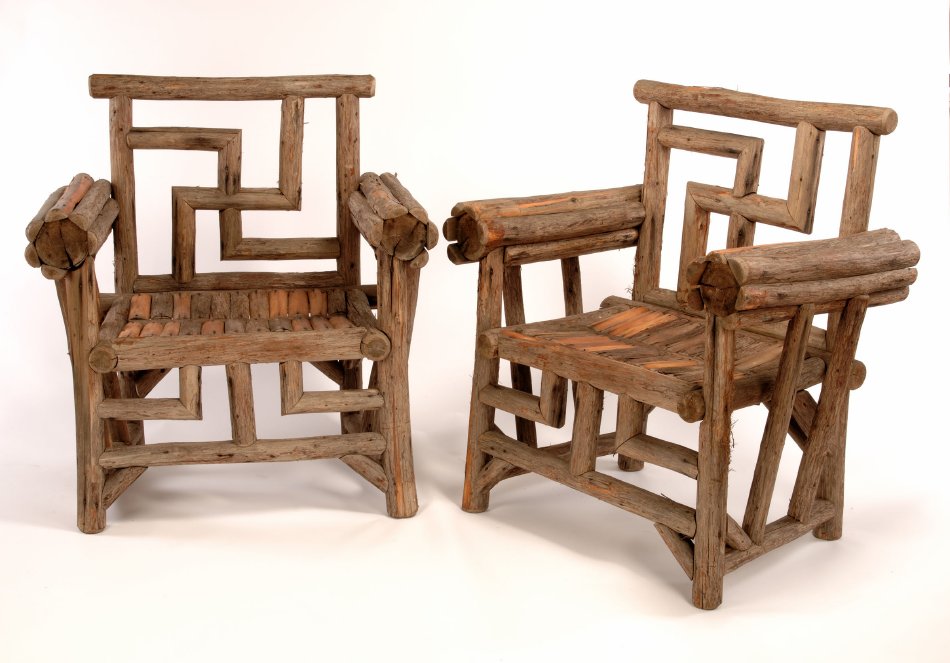 Charles Sumner (ca. 1861-1937) made these cedar armchairs for Camp Iroquois on Upper Saranac Lake. The backrests are in the form of a swastika, an ancient symbol traditionally associated with life, light, strength, eternity, and good luck. In 1920, the Nazi Party of Germany adopted the swastika, reducing this symbol of life to an icon of evil.