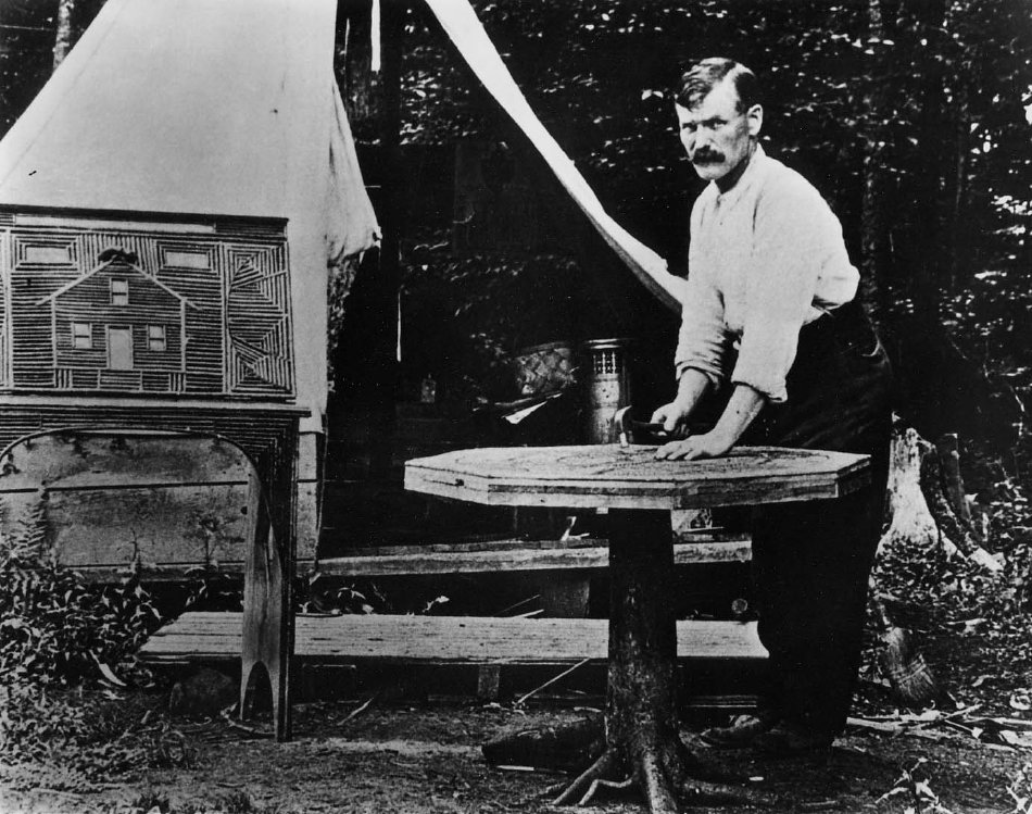 Little is known about George Wilson (probably 1876 - 1939). He worked for a time as a gardener at Sagamore Lodge near Raquette Lake and at the Lake View Lodge in Big Moose doing carpentry work. His furniture is embellished with elaborate mosaic twigwork, as with the piece seen at left in this photograph.