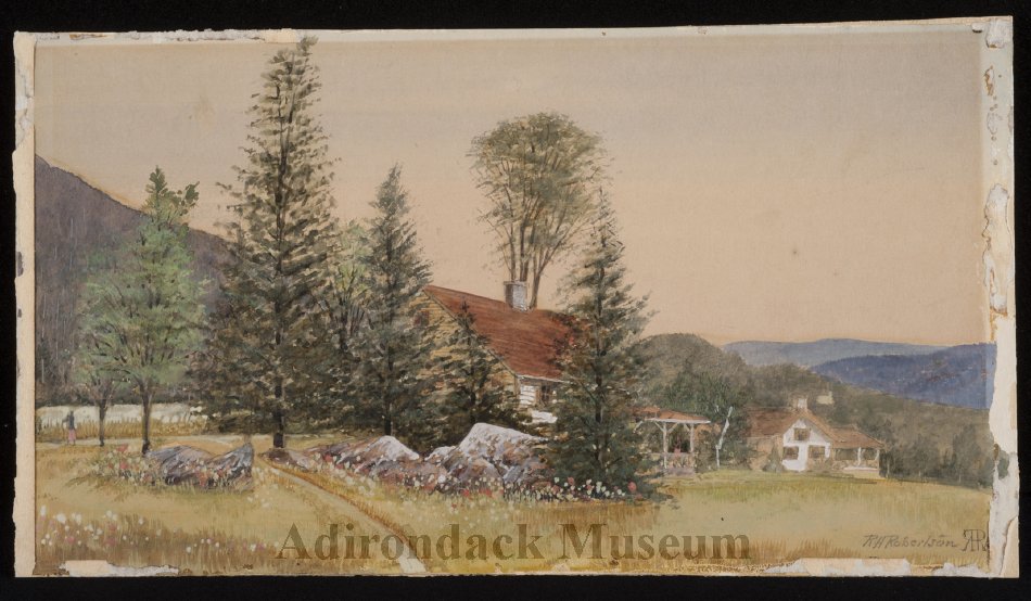 Architect Robert H. Robertson (1849-1919) was well-acquainted with the Adirondacks, having designed Great Camps Santanoni and Nehasane. He was also a member of the Tahawus Club, and painted this view of the nearby McNaughton Cottage in the abandoned village of Adirondac. Robertson was on a fishing trip at Nehasane when he died of a heart attack.