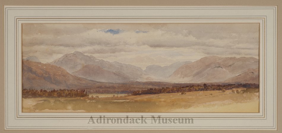 This view by Samuel Colman, Jr. (1832-1920) depicts mountains Wright, Algonquin, Wallface, Street, and Nye from Scott's Clearing in the High Peaks region.