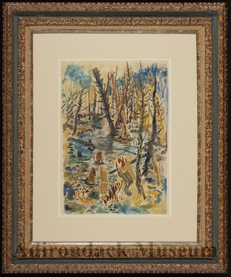 German-born painter George Grosz (1893-1959) was an outspoken critic of the Nazi party, escaping with his family to the United States in 1933. Best known for painting satirical commentaries on politics and society, a weary Grosz turned away from the "damned, avid faces of little men," toward nature, which he found to be "rejuvenating--like spring water." An August, 1943 trip to Garnet Lake in the Adirondack Mountains was a chance to rediscover his boyhood and find peace far from the turbulence of World War II.