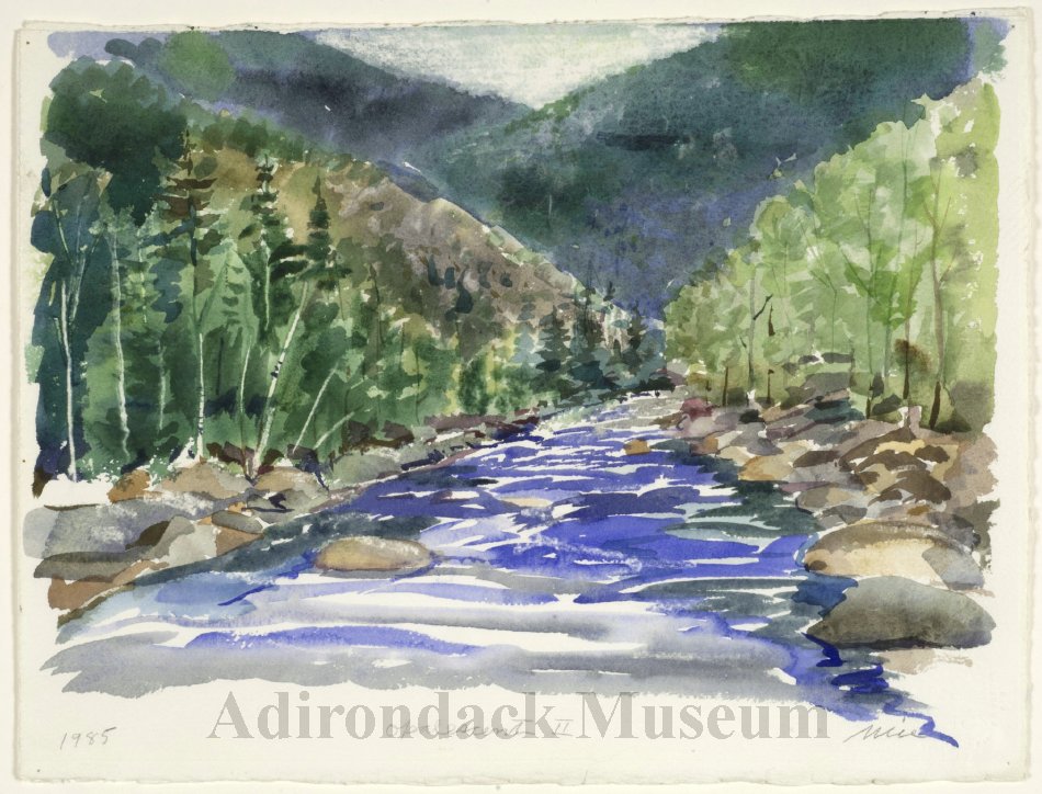 Artist Don Nice (1932-2019) painted Opalescent II from a raft during a 1985 trip down the upper portion of the Hudson River. Nice spent two weeks, guided by two rangers, trekking from the Hudson's source, Lake Tear of the Clouds, to the Statue of Liberty in New York Harbor. He noted that the "water [depicted] is rough…filled with rapids, so we were all dressed in wet suits."